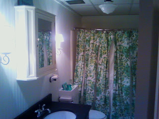 For the bath we saved the cabinet; just added a remnant of honed black granite, new pulls and some Valspar's Lincoln Cottage Black and it is fresh enough for us!